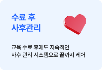 과정중에는 취업지원상담, 취업특강이 진행되며, 과정 수료 후에는 6개월간 사후취업관리를 받으실 수 있습니다.